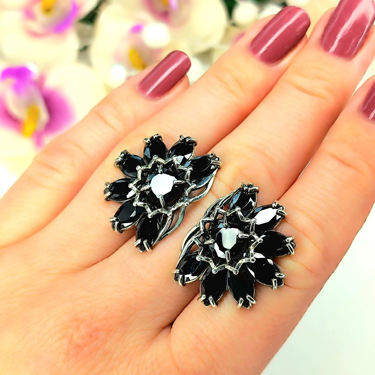 Вечірні срібні сережки чорна квітка